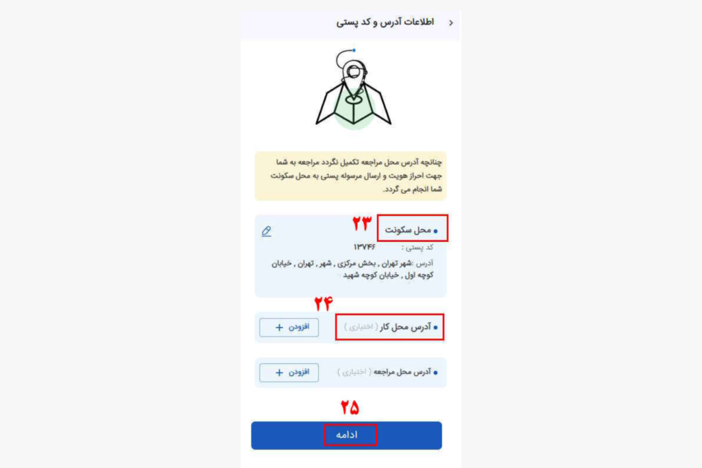 آدرسی که در جزئیات آدرس از طریق کد پستی استعلام میشود، دقیق نیست؛ لذا برای اینکه کارت بانکی در محل مورد نظر تحویل داده شود، آدرس دقیق خود را در آدرس تکمیلی وارد کنید.