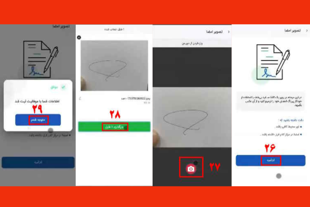 26- بر روی یک صفحه کاغذ امضا کنید و از آن عکس بگیرید و گزینه ادامه را انتخاب نمایید.