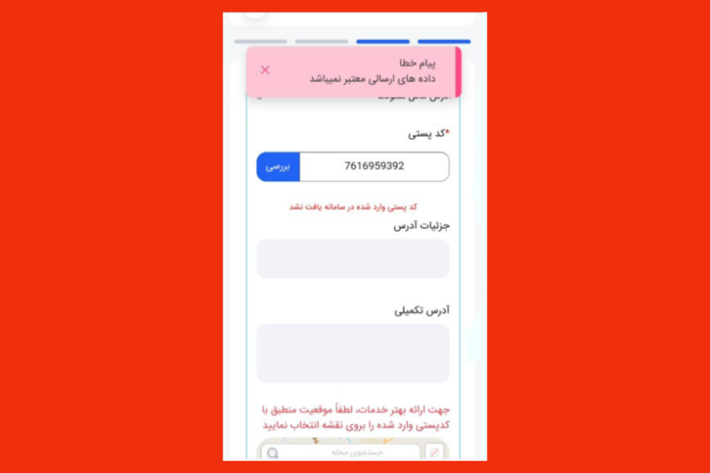 اگر کد پستی صحیح بود اما سامانه، آن را نپذیرفت، بهتر است با کد پستی و آدرس محل دیگری، مجددا تلاش کنید.