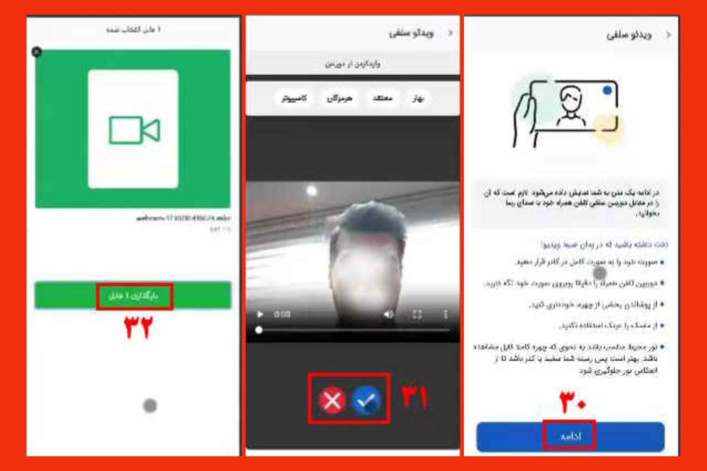 - هشتم، برای احراز هویت باید از خودتان فیلم سلفی بگیرید. هر اختلاف ظاهری با تصویر ثبت شده در سامانه ثبت احوال که روی کارت ملی درج شده است، ممکن است باعث بروز خطا شود؛ مثلا تفاوت داشتن ظاهر محاسن برای آقایان، آرایش غلیظ برای بانوان و یا داشتن عینک.