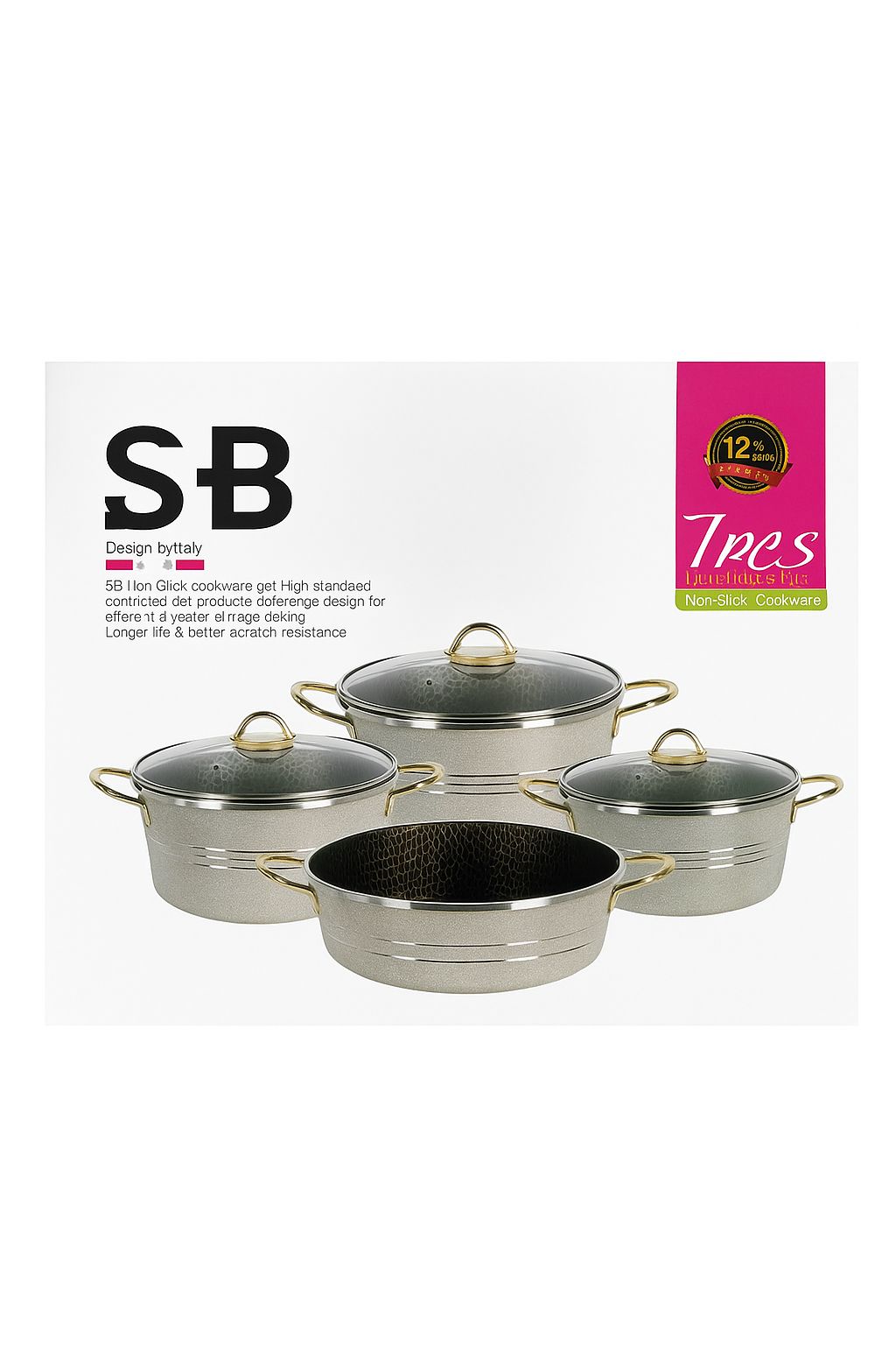 نام برند: SB طراحی: Design by Italy نوع محصول: ست قابلمه نچسب (Non-Stick Cookware Set) تعداد قطعات: 7 عدد (7 pcs Kitchenware) ویژگی‌ها: روکش نچسب با کیفیت بالا طراحی پیشرفته برای صرفه‌جویی در انرژی و زمان پخت دوام بالا و مقاومت در برابر خط و خش جنس بدنه مقاوم با طرح لانه‌زنبوری (Honeycomb texture) دارای درب شیشه‌ای مقاوم در برابر حرارت دستگیره‌های فلزی مقاوم (طلایی یا آبکاری‌شده) گارانتی 12 ماهه (12 Month Warranty) شرکت 🧂 مناسب برای: پخت‌وپز روزانه (غذاهای خانگی، خورشت، برنج و غیره) استفاده روی گاز یا اجاق‌های معمولی خانواده‌ها یا آشپزخانه‌های حرفه‌ای که دنبال دوام بالا و ظاهر لوکس هستند